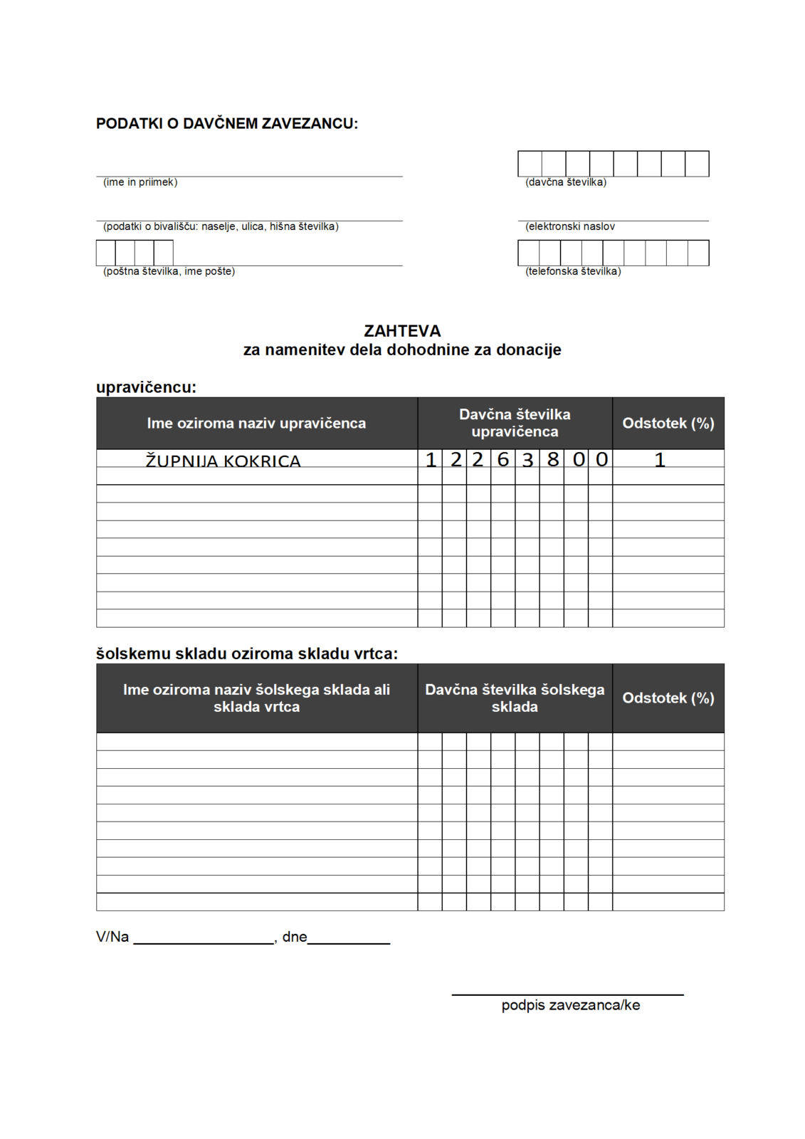 Prosimo vas, da svojo izjavo o namenitvi dela dohodnine čim prej izpolnite preko sistema e-davkov (varni elektronski podpis ni potreben) ali po pošti na davčni urad Kranj po obrazcu.