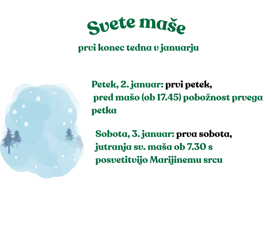 Na prvo soboto, 3. januarja, je jutranja sveta maša ob 7.30 s posvetitvijo Marijinemu srcu.